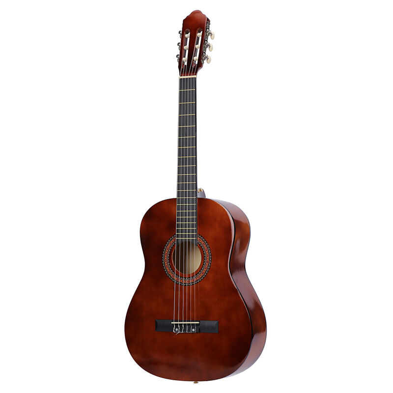 Gemütliches Zusammensein Zuhause oder beim Campen – einzig eine Gitarre fehlt, um ein paar Lieder zu singen? Die formschöne Akustikgitarre in rötlichem Braun ist das ideale Instrument für Amateur-Musiker und Anfänger. Im Set enthalten sind drei farbige Plektra, Ersatz-Saiten sowie ein praktischer Gurt. Transportieren lässt sich die Gitarre ganz einfach in dem mitgelieferten Rucksack. Die Nylon-Saiten der 12-Bund Gitarre spielen Sie mit den Fingern oder mit einem der Plektra. Ein schickes Instrument für erste musikalische Experimente. Fühlen Sie den Rhythmus und lassen Sie Ihrer Kreativität freien Lauf!