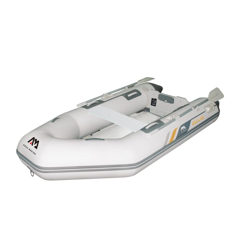 Das sportliche Schlauchboot DELUXE ist schnell aufgebaut und einsatzbereit. Es bietet bequem Platz für vier Personen. Durch die A-Form ist das Boot wendig und einfach zu manövrieren. Das Alu-Deck verleiht besondere Stabilität und sorgt für sicheren Stand der Passagiere. Für den einfachen Transport und die platzsparende Lagerung ist der Boden zerlegbar. Dank des robusten Heckbalkens hast du die Möglichkeit das Boot mit einem Aussenbordmotor auszustatten. Freue dich auf unbeschwerte Stunden auf dem Wasser mit diesem komfortablen und sicheren Schlauchboot von Aqua Marina!