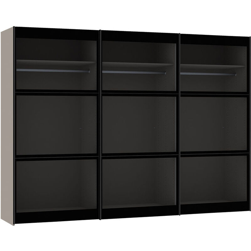 Schwebetürenschrank – Kleiderschrank Arena Collection – Holzwerkstoff/Glas – B 301 T 65 H 220 cm – Korpus Nougat, Front Rauchglas dunkel, Aufclipprofil schwarz matt, 3 Schliessdämpfer, inkl. 3 Tablare und 3 Kleiderstangen