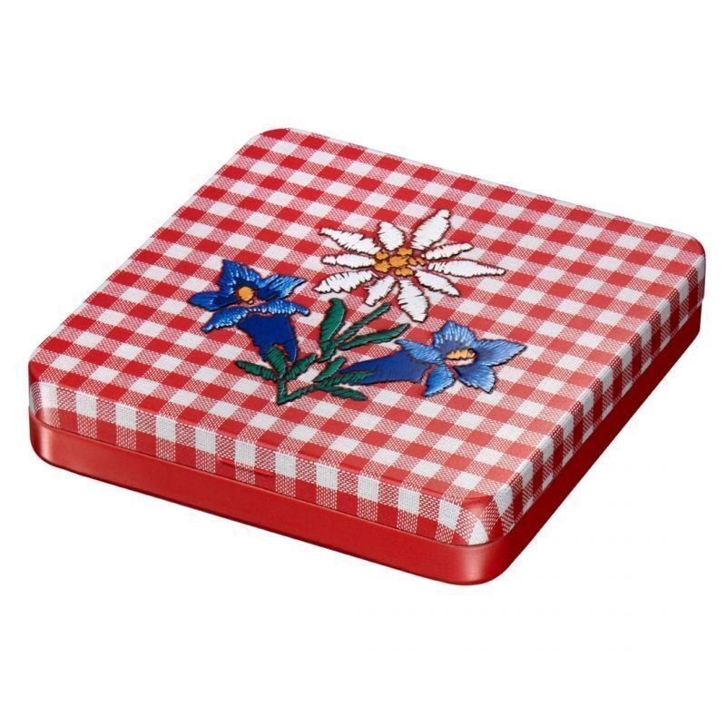 Blechdose eckig, bedruckt, leer Innenmasse LxBxH: 8.75 x 8.40 x 1.75 cm Gewicht: 40 g Die eckige Dose im Edelweiss Karo Design ist aus stabilem Weissblech gefertigt. Das stylische Accessoire passt in jede Tasche und begleitet dich überall hin. Im praktischen Metalletui sind Elektronik, Schmuck, Wertsachen, Hygieneartikel und andere kleine Utensilien unterwegs gut aufgehoben. Dekoration: Rundum Offset bedruckt und schutzlackiert, Sujet geprägt. 100% rezyklierbar, Swiss made