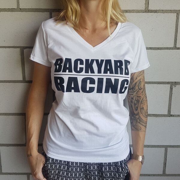 Das originale Backyard Racing Womens-Shirt in weiss, mit qualitativem Gildan Premium V-Neck Shirt und hochwertigem Druck!