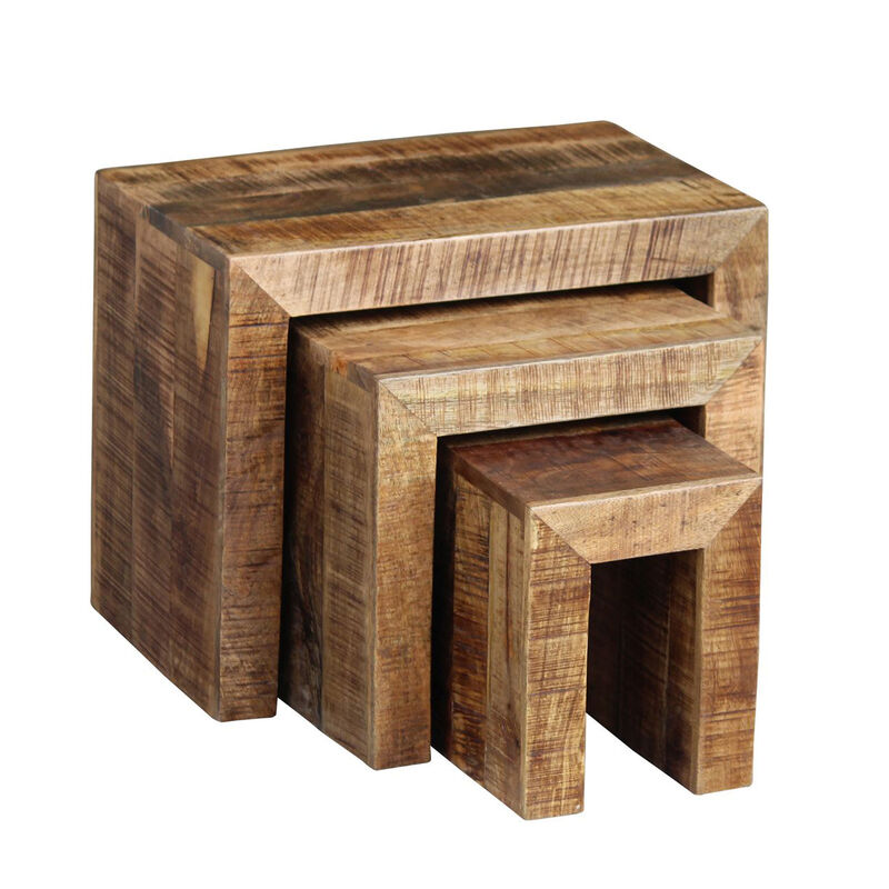 Diese schlichten Beistelltische aus Mangoholz passen zu jedem Einrichtungsstil. Das Set mit drei unterschiedlich grossen Tischen bietet unzählige Anordnungs- und Verwendungs-Möglichkeiten. Die Struktur des Holzes sorgt für einen rustikalen Vintage-Look. Bei Nicht-Gebrauch können die kleineren Tische einfach unter den Grösseren gestellt werden. Ergänze deine Wohnzimmereinrichtung mit diesen praktischen Couchtischen!