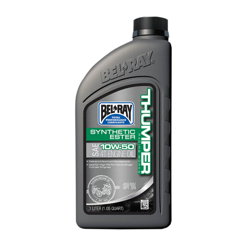 BEL-RAY THUMPER® RACING 4T-MOTORÖL MIT SYNTHETISCHER ESTERMISCHUNG FEATURES: * Dieses vollsynthetischen, esterbasierende Öl hält auch höchsten Temperaturen und Belastungen stand und ergibt so das ultimative 4-Takter Motoröl * Für alle 4-Takt-Motorräder mit oder ohne Nasskupplungen geeignet * Thumper Motoren (Einzylinder- und Mehrventil-Rennmotoren) * Besserer Verschleißschutz und geringere Ringabnutzung, für eine längere Lebensdauer der Lager * Bessere Ablagerungskontrolle entfernt Ablagerungen, steuert Bildung von Schlamm und Verlackung, verhindert Karbonablagerungen an Kolbenringstegen * Hohe Viskositätsstabilität die Scherstabilität bietet bessere Schmierung und Filmstärke, minimiert Reibung für maximale Leistung * Reibungslose Kraftübertragung verhindert Verhaken der Kupplung und ermöglicht so einfach gesteuerte und effiziente Gangwechsel und Kupplungsbedienung * Erfüllt oder übertrifft die Anforderungen von API SM/SG/SH/SJ/SL/SN und JASO MA/MA1/ MA2 Bel-Ray,Belray,BELRAY,belray,10W50,motoröl,motorenöl,motorrad oel,motorenoel,getriebeöl,motoreol,ölwechsel,getriebe oel,4t oel,vollsynthetisch,100 syntetisch,4t vollsynt,viertakt motorenöl,viertakt vollsynt,huile moteur,engine oil,olio motori,race oil,rennöl,rennmotorenöl Passend auf: APRILIA MXV450 RXV450 SXV450 SXV550 ARCTIC CAT 150 Utility 2×4 250 2×4 250 DVX 300 2×4 300 4×4 300 DVX 400 DVX 400 TRV 500 4×4 500 FIS 4×4 500 TBX 4×4 500 TRV 4×4 550 TRV 650 H1 650 V2 4×4 700 H1 EFI 700 TRV 700 TRV H1 EFI 700i 90 DVX Bearcat 660 Wide Track Mudpro 1000 Thundercat 1000 TRV 1000 Wildcat 1000 Wildcat 700 ATK 350 Dual Sport 350CC/CCES 450 Enduro/XC 450 MX 490 CC/ES 600 DT 605 CC/ES/Enduro 605 Dual Sport 605 Police BETA Evo 250 4T Evo 300 4T REV3 250 4T RR 4T 125 LC RR 4T Enduro 125 RR 4T Enduro 350 RR 4T Enduro 390 RR 4T Enduro 400 RR 4T Enduro 430 RR 4T Enduro 450 RR 4T Enduro 480 RR 4T Enduro 498 RR 4T Enduro 520 RR 4T Enduro 525 RR 4T Motard 125 RR 4T Racing 350 RR 4T Racing 390 RR 4T Racing 400 RR 4T Racing 430 RR 4T Racing 450 RR 4T Racing 480 RR 4T Racing 498 BMW G 450 X G 650 Xchallenge CAN-AM Commander 1000 Commander 800R DS 250 DS 450 X DS 650 DS 650 X DS 70 DS 90 DS 90 X Maverick 1000R Maverick Turbo X Outlander 400 Outlander 400 EFI Rally 175 Renegade 500 STD Renegade 800R CANNONDALE C 440/E 440 X 440/s CCM 404 Dual Sport 604 Dual Sport 644 Dual Sport FANTIC Caballero TF250ES Caballero TZ170E Caballero TZ170M Caballero TZ200ER Caballero TZ200M XEF 250 XEF 450 XEF 450 RALLY XXF 250 XXF 450 GAS GAS EC 250 F (4T) EC 250F EC 300 F (4T) EC 350F EC 450 F EC 450F EC 500F FSE 450 FSE 450 SM FSR 450 FSR 450 SM MC 250F MC 350F MC 450F Wild HP 450 HONDA 4RT 260 Montesa Cota ATC110 ATC90 CRF100F CRF110F CRF125F CRF150F CRF150R CRF150R Expert CRF230F CRF230L CRF230M CRF250F CRF250L CRF250L Rally CRF250R CRF250RX CRF250X CRF300L CRF300RL Rally CRF450L CRF450R CRF450RX CRF450X CRF50F CRF70F CRF80F CT110 Trail CT70 CT70 Mini Trail CT90 Trail NX125 NX250 NX650 SL100 ST90 TLR200 Reflex TR200 Fat Cat TRX200D TRX250 Recon TRX250EX TRX250TE TRX250TM TRX250X TRX300EX TRX300FW TRX350 TRX350A Fourtrax TRX350D Foreman TRX400 TRX400EX TRX400FW TRX400X TRX420 TRX450ER TRX450ES TRX450FE TRX450FM TRX450R TRX450S TRX500 TRX500FA TRX650 FA TRX700XX XL 125 R XL100 XL100S XL125S XL185S XL200R XL250R XL250S XL350R XL500R XL500S XL600R XL600V Transalp XL650V Transalp XL75 XL80 XL80S XLR 125 R XR100 XR100R XR200 XR200R XR250 XR250L XR250R XR350R XR400R XR500 XR500R XR50R XR600R XR650L XR650R XR70R XR75 XR80 XR80R Z50 Z50R HUSABERG FC450 FC501 FC550 FC650 FE250 FE350 FE390 FE400/E FE450 FE450E FE501 FE501/E FE550E FE570E FE600/E FE650E FS450C FS450E FS550E FS600E FS650E FX450 FX450E FX600E FX650E FXE600 HUSQVARNA 701 Enduro 701 Enduro LR 701 Supermoto FC250 FC350 FC450 FE250 FE350 FE450 FE501 FR450 Rally FS450 SM610 SMR449 SMR450 SMR510 SMR511 SMS630 TC250 TC449 TC450 TC510 TE250 TE310 TE410/E TE449 TE450 TE510 TE511 TE570 TE630 TXC250R TXC310R TXC450R KAWASAKI KAF620 MULE 3000 KAF620 MULE 3010 4×4 KAF620 MULE 4000 KAF620 MULE 4010 4×4 KEF300 Lakota KFX250 Mojave KFX400 KFX450R KFX50 KFX700 KFX90 KL250 KL250 Super Sherpa KL250R KL600 KL650 KL650R Tengai KLF220 Bayou KLF300 Bayou KLF300 Bayou 4×4 KLR600 KLR650 KLX110 KLX110L KLX125 KLX125L KLX140 KLX140L KLX250 KLX250R KLX250S KLX250SF KLX300R KLX400R KLX400SR KLX450R KLX650C KLX650R KRF750 Teryx 4×4 KRF750 Teryx4 4×4 KRF800 Teryx KSF250 Mojave KVF360 Prairie KVF400 KVF650 Brute Force KVF650 Brute Force 4x4I KVF650 Prairie KVF700 Prairie KVF750 Brute Force 4x4I KX250F KX450F KTM 250 EXC-F 250 SX-F 350 EXC-F 350 SX-F 400 EXC 400 EXC Racing 400 LC4/SXC 400 SX 450 EXC 450 EXC Racing 450 EXC-F 450 Rally 450 SMR 450 SX 450 SX Racing 450 SX-F 450 SX-F Factory Edition 500 EXC 500 EXC-F 505 SX ATV 505 SX-F 520 EXC 520 SX 525 EXC Racing 525 SMR 525 SX 525 XC ATV 530 EXC 530 EXC-R 625 SMC 640 LC4 Adventure Freeride 250 F Freeride 350 LC4 400 EXC LC4 620 E-XC LC4 620 Six-Days WP LC4 620 SX KYMCO MXU 250 MXU 250R MXU 400 4×4 MXU 500 2×4 MXU 5