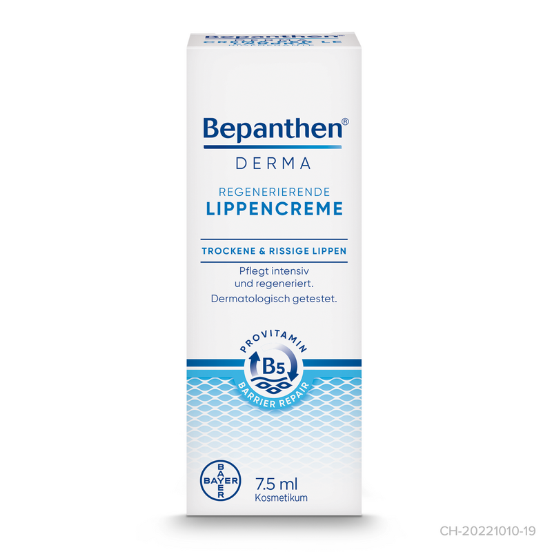 Bepanthen® Derma Regenerierende Lippencreme pflegt trockene, rissige Lippen. Bepanthen® Derma Regenerierende Lippencreme eignet sich zur täglichen Pflege trockener, rissiger Lippen. Das enthaltene Dexpanthenol fördert einerseits die natürliche Hautregeneration und spendet gleichzeitig Feuchtigkeit. Dadurch werden die Lippen genährt, der Hautaufbau wird gefördert. Die regenerierende Lippencreme eignet sich ideal über Nacht als Intensivpflege.