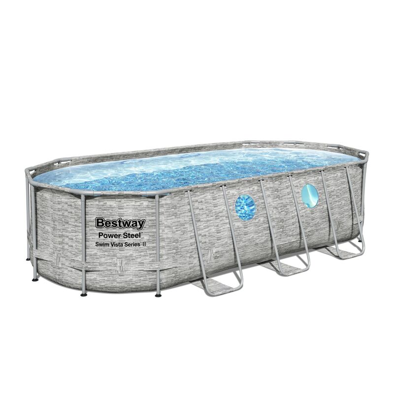 Dieser Aufstellpool von Bestway überzeugt mit Komfort, moderner Optik und Widerstandfähigkeit. Dank dem Stahlrahmen und der dreilagigen Poolfolie ist das Schwimmbecken besonders robust und langlebig. In die Poolwände in Steinwandoptik sind zwei runde Sichtfenster eingelassen, damit Sie Ein- und Ausblick geniessen können. Die Filterpumpe sorgt jederzeit für hygienisch sauberes Wasser und ungetrübten Badespass. Geniessen Sie an heissen Sommertagen die Abkühlung im eigenen Pool!