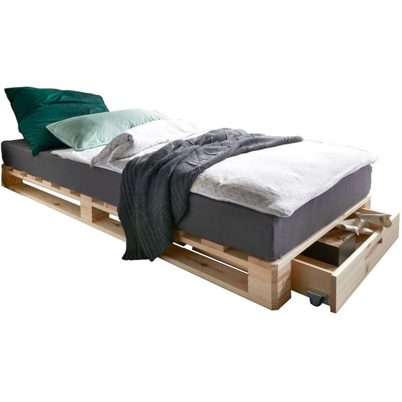 Palettenbett – Bett Flynn – Kiefer – B 200 T 90 H 14 cm – Innanmaße Schubladen 62,2×64,5×8,9 – mit 1 Rollschubkasten