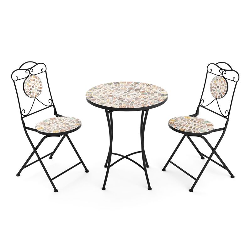 Dieses Bistroset mit bunt gemusterten Mosaiken wird zum Blickfang auf deinem Balkon oder der Gartenterrasse. Zwei Klappstühle laden zum Verweilen am runden Bistrotisch ein. Mit diesen Möbeln kannst du auf kleiner Fläche, sowohl draussen als auch drinnen, eine gemütliche Sitzgelegenheit schaffen. Setze dich hin und entspanne dich bei einem Drink oder einem Kaffee an diesem hübschen Bistrotisch!