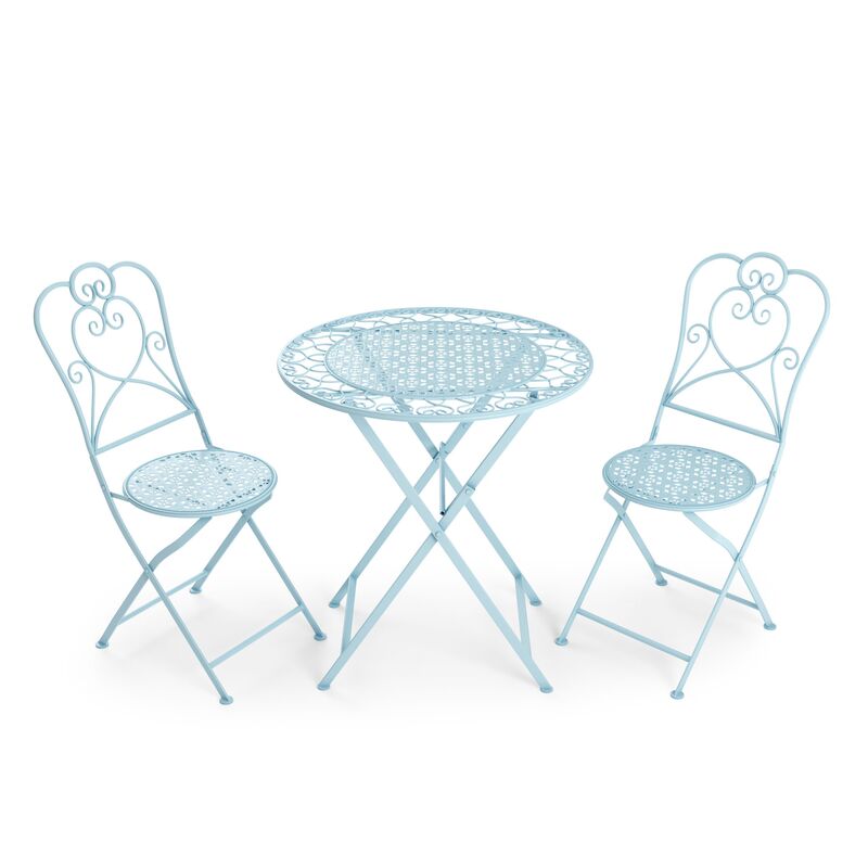Dieses Bistroset in Hellblau besteht aus einem runden Tisch und zwei Stühlen. Es eignet sich perfekt für den Morgenkaffee vor der Arbeit oder einen Apéro am Abend mit deinem Schatz. Die beiden Stühle verfügen über eine angenehm grosse Sitzfläche und runden den eleganten Look mit den filigranen Verzierungen an den Lehnen perfekt ab. Bei Nichtgebrauch kannst du die Stühle und den Tisch einfach zusammenklappen und wegstellen. Bestell dir noch heute dieses Bistroset für deinen Balkon oder die Terrasse!