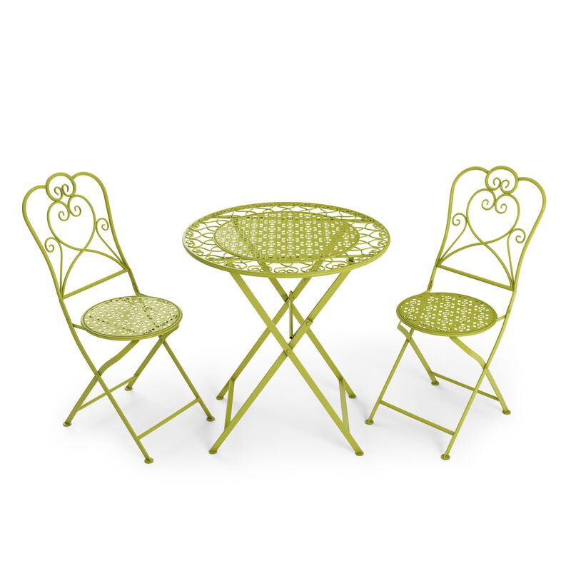Elegantes Design, farbenfroh, robust und platzsparend – dies sind Eigenschaften von diesem Bistroset PAULINE. Es besteht aus zwei Stühlen und einem runden Tisch mit wunderschönen filigranen Verzierungen. Das Balkonmöbel Set ist aus wetterfestem und pflegeleichtem Material gefertigt, und daher ideal für den Aussenbereich geeignet. Bei Nichtgebrauch kannst du die Möbel ganz einfach zusammenklappen und wegstellen. Bringe Farbe in dein Leben und auf deinen Balkon mit diesem Bistroset in Hellgrün!