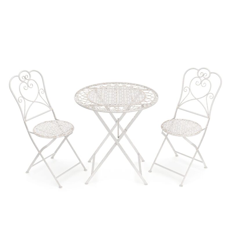 Dieses wetterfeste und pflegeleichte Bistroset setzt ein Highlight auf deinem Balkon. Der angesagte Vintage-Look und die filigranen Verzierungen ergänzen sich perfekt. Das Set besteht aus zwei Stühlen und einem runden Tisch. Bei Nichtgebrauch kannst du die Möbel ganz einfach zusammenklappen und wegstellen. Gestalte deinen Balkon modern und einladend mit diesem Bistroset PAULINE!