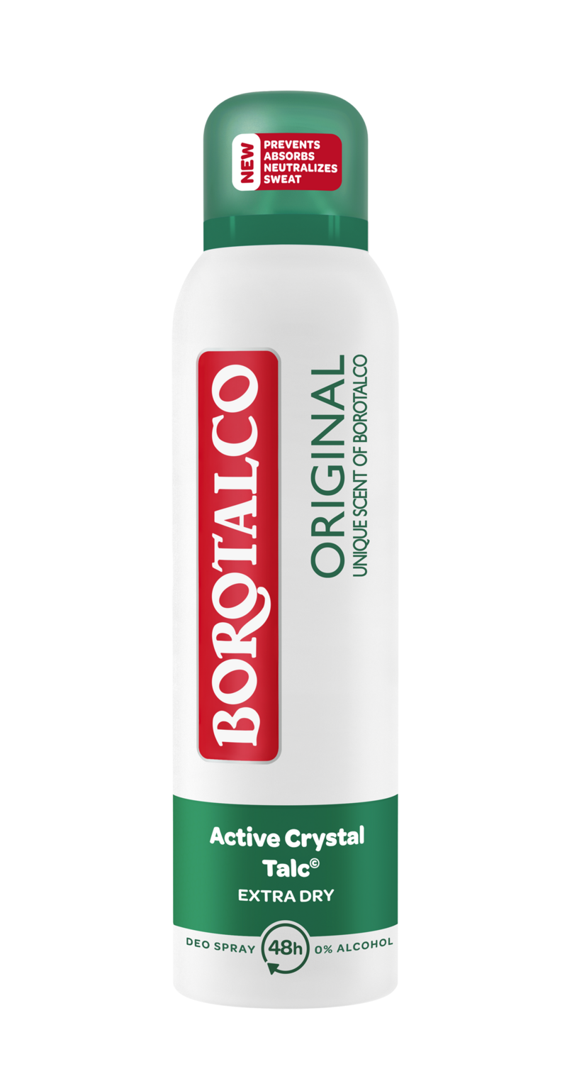 Ein neues Borotalco-Erlebnis mit Borotalco Original Deodorant, das dank der innovativen Active Crystal Talc™ dreifachen Trockenschutz bietet: – verhindert den Schweiss, indem es seine Bildung begrenzt – absorbiert Schweiss wenn er auftritt – neutralisiert die Schweissmoleküle – mit 0 % Alkohol. Dermatologisch getestet.