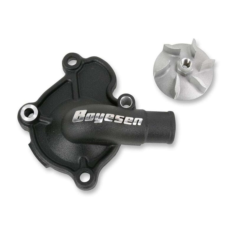 BOYESEN SUPERCOOLER WASSERPUMPENKIT Der Boyesen Supercooler Wasserpumpenkit besteht aus einem Aluminium-Feinguss Wasserpumpendeckel und Wasserpumpenrad und wurde speziell entwickelt um die Leistung des Kühlsystems zu verbessern. Dieses Wasserpumpenkit wurde getestet und entwickelt, um mehr Kühlwasser fliessen zu lassen. Dadurch dass die Strömung und der Druck höher sind wie beim Original, wird der Motor besser gekühlt und die Temperatur ist durchgehend niedriger. * Bessere Kühlung * Leistungsstärkste Wasserpumpe auf dem Markt * Verlängert die Motor Lebensdauer * Patentiertes Wasserpumpenrad * Wird von vielen Werkteams eingesetzt Ailette pompe a eau,motor zu heiss,wasserpumpe,pumpleistung,kühlwasser,water pump cover,wasserpumpenrad,überhitzungsprobleme,overheating Passend auf: HONDA CRF250R