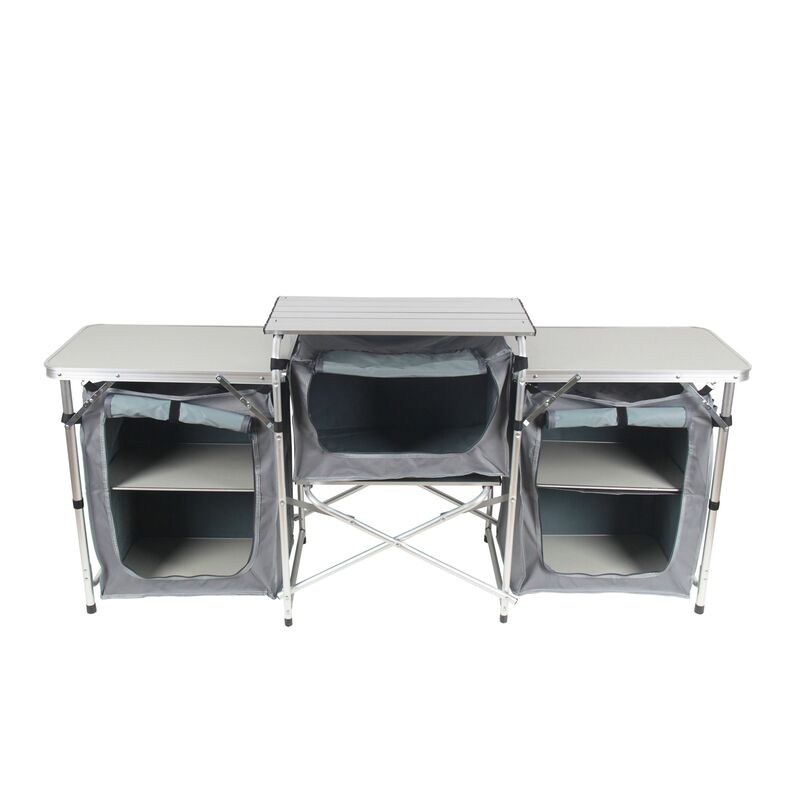 Mit dieser grosszügigen Campingküche sind sie ideal ausgestattet für Ihre Ferien. Schnell aufgeklappt bietet dieses Campingmöbel viel Platz zum Zubereiten feiner Menüs. Der Aufsatz für das Mittelteil kann als Wind- und Spritzschutz verwendet werden. Vorräte, Pfannen und Geschirr verstauen Sie ganz einfach in den zahlreichen Fächern. Die Reissverschlusstüren sind simpel in der Handhabung und können bei Bedarf einfach hochgerollt werden. Nach Gebrauch kann die Campingküche platzsparend in der mitgelieferten Tasche verstaut werden. Worauf warten Sie? – Küche aufklappen und los geht der Kochspass!