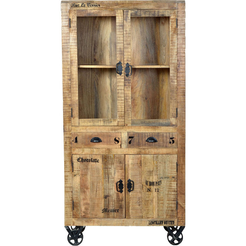 Vitrine – Vitrine Rusc – Holz – B 90 T 40 H 180 cm – Vitrine aus lackiertem Mangoholz mit starken Gebrauchsspuren, vier Türen, zwei Schubladen, Rollen und je einem Boden hinter den Türen.