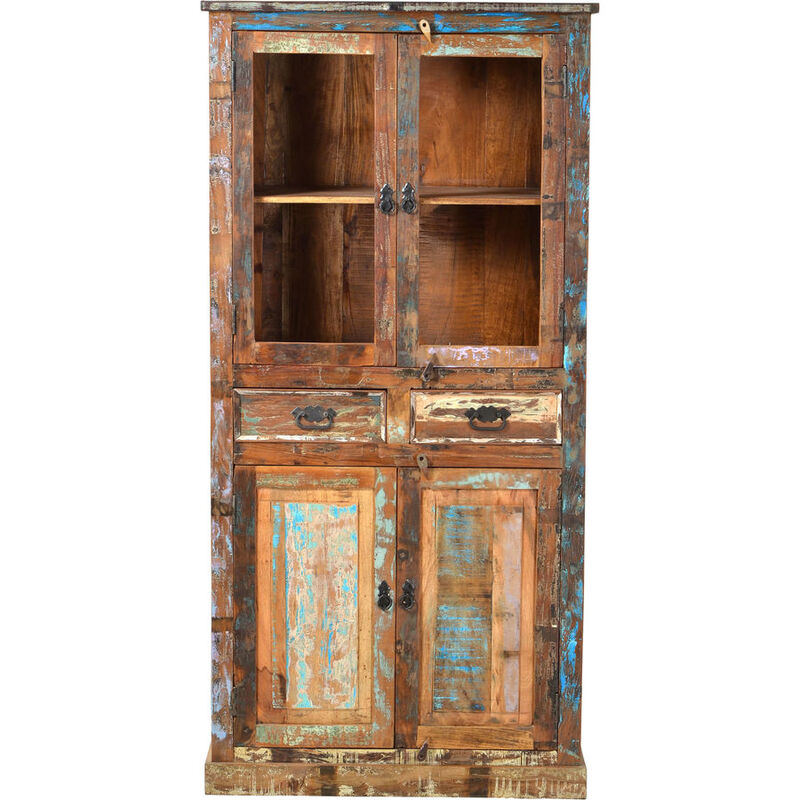 Vitrine – Vitrine South – Holz – B 90 T 40 H 180 cm – Vitrine aus recyceltem Altholz mit starken Gebrauchsspuren (lackiert). Mit zwei Holztüren, zwei Glastüren, zwei Schubladen und je einem Boden hinter den Türen.