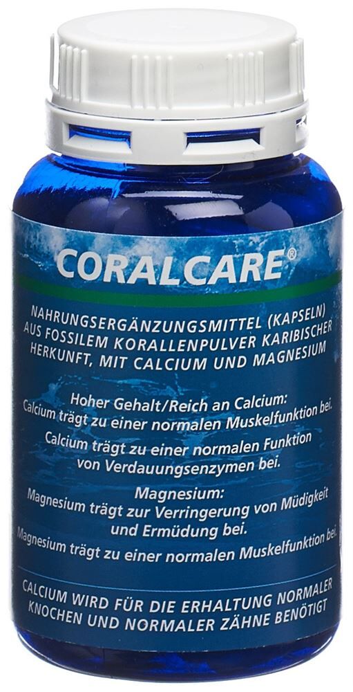 Sachbezeichnung Coralcare Calcium mit Magnesium Coralcare Calcium mit Magnesium Zusammensetzung 1 Kapsel enthält Calcium 275mg Magnesium 150mg Vegetarische Kapselhülle Hpmc Hydroxypropylmethylcellulose Karibik. Eigenschaften Das Calcium wird aus fossilen Korallen der Karibik gewonnen die oberhalb des Meeresspiegels sindCORALCARE ist ein Eco-Safe ProduktMagnesium-oxid und von KorallenVegetarische Kapselhülle Hpmc Hydroxypropylmethylcellulose Anwendung 2 Kapseln pro Tag mit ausreichend Flüssigkeit schlucken. Nahrungsergänzungsmittel sollten nicht als Ersatz für eine ausgewogene, abwechslungsreiche Ernährung verwendet werden und ersetzen nicht eine gesunde Lebensweise. Ausserhalb der Reichweite von kleinen Kindern lagern. Die empfohlene Tagesdosis darf nicht überschritten werden. Tagesration von 2 Kapseln entspricht der empfohlenen Tagesdosis bei Calcium 68.75% und Magnesium 80%. Die angegebene Tagesration sollte nicht überschritten werden Hinweise trocken lagern Enthält Calcium und Magnesium ohne künstliche Farbstoffe oder Aromen
