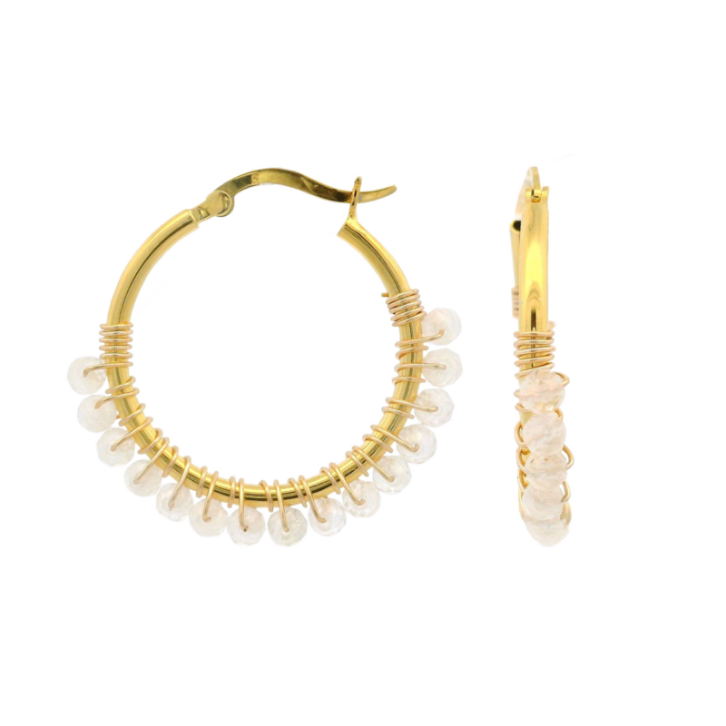 Die Ohrringe Mia sind mit ihrer Creolen-Form und den von Hand gefertigten Drahtbewegungen ein echter Hingucker.Das Highlight sind die Mondstein-Perlen, welche die Creolen rundherum schmücken.Die Creolen selbst sind aus Silber vergoldet und haben einen Durchmesser von 25mm.