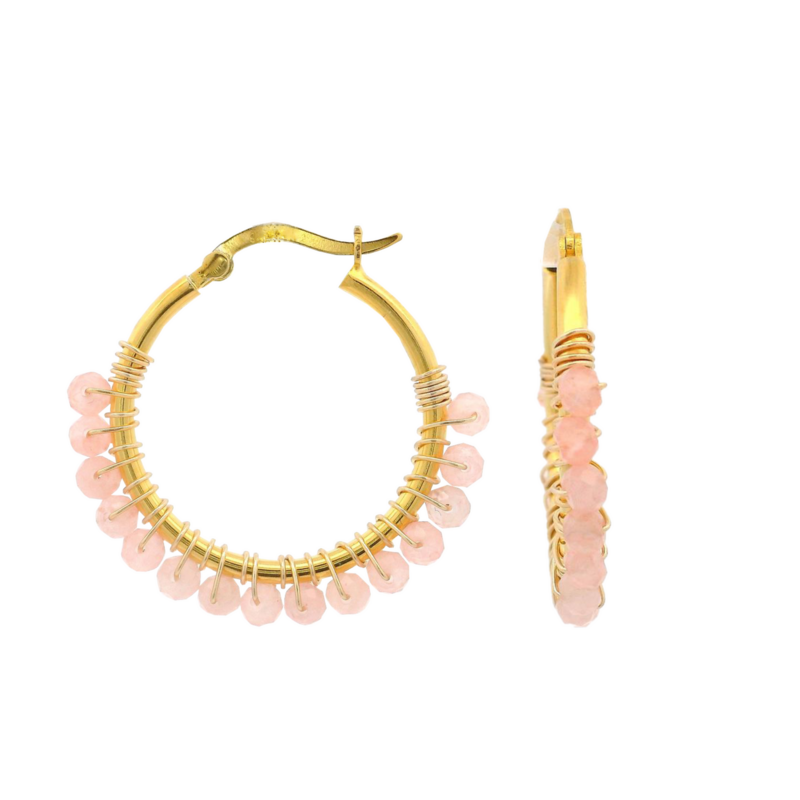 Die Ohrringe Mia sind mit ihrer Creolen-Form und den von Hand gefertigten Drahtbewegungen ein echter Hingucker.Das Highlight sind die Rosenquarz-Perlen, welche die Creolen rundherum schmücken.Die Creolen selbst sind aus Silber vergoldet und haben einen Durchmesser von 25mm.