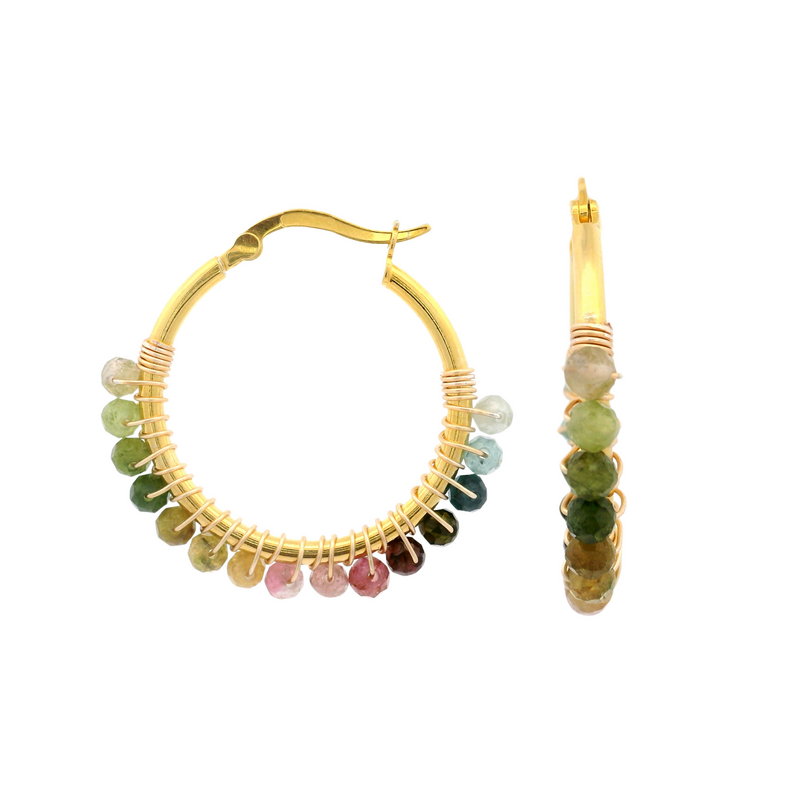 Die Ohrringe Mia sind mit ihrer Creolen-Form und den von Hand gefertigten Drahtbewegungen ein echter Hingucker.Das Highlight sind die Turmalin-Perlen, welche in allen Farben des Regenbogens die Creolen schmücken.Die Creolen selbst sind aus Silber vergoldet und haben einen Durchmesser von 25mm.