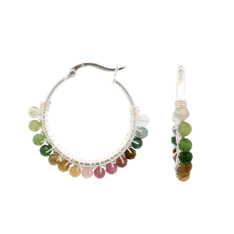 Die Ohrringe Mia sind mit ihrer Creolen-Form und den von Hand gefertigten Drahtbewegungen ein echter Hingucker.Das Highlight sind die Turmalin-Perlen, welche in allen Farben des Regenbogens die Creolen schmücken.Die Creolen selbst sind aus Silber vergoldet und haben einen Durchmesser von 25mm.