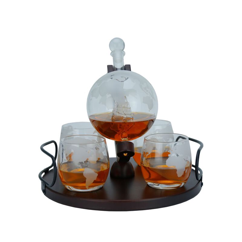 - Dekanter in Form eines Globus und einem Segelschiff im Inneren