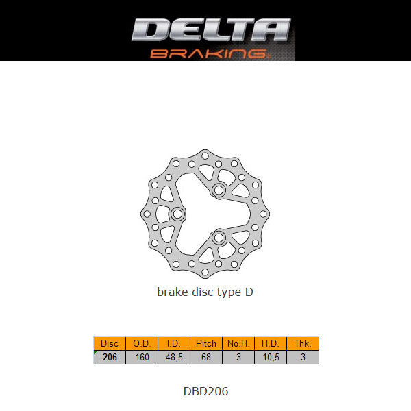 DELTA BRAKING QUAD-D-WAVE BREMSSCHEIBE 160MM VORNE DBD206 Delta Braking Bremsscheiben haben Ihren Ursprung im Motocross und Offroadbereich. Das Know-How und die Erkenntnisse in diesem extremen Einsatzbereich führten zu einer Entwicklung von High Quality Bremsscheiben welche heute in allen Rennkategorien sowie auf der Strasse in allen Hubraumgrössen Verwendung finden. Hochwertige Wettbewerbs-Bremsscheibe im Wave-Design von Delta Braking . Ansprechendes Design und hochlegierter Bremsscheibenstahl machen diese Bremsscheibe zu einer echten Alternative gegenüber der Originalbremsscheibe. Die spezielle Wave-Form führt die beim Bremsvorgang enstehende Hitze deutlich besser ab als herkömmliche Bremsscheiben. Das führt zu kühleren Bremsbelägen und dadurch dauerhaft höherer Bremsleistung. Die ausgefallene Form bringt die Bremsen nicht nur technisch gesehen auf Vordermann sonder lässt auch das Herz jedes Optikfans höher schlagen. – Markenqualität von Delta Braking – top Verarbeitung – lange Lebensdauer – hohe Passgenauigkeit – bessere Bremsleistung und erhöhte WärmeleitfähigKEIT Beschreibung der Werte im Bild: DISC: Artikelbezeichnung O.D.: Gesamtdurchmesser in mm I.D.: Innendurchmesser in mm PITCH: Lochkreidurchmesser in mm NO.H.: Anzahl Schraublöcher H.D.: Schraublochdurchmesser in mm THK.: Dicke der Scheibe in mm Geeignet für alle Brembelagstypen. BITTE DIE AUFGEFÜHRTE VERWENDUNGSLISTE PRÜFEN OB DIE SCHEIBE VORN ODER HINTEN FÜR DAS FAHRZEUG PASSEND IST. Verwendungsliste Delta Braking Bremsscheiben vorn & hinten.