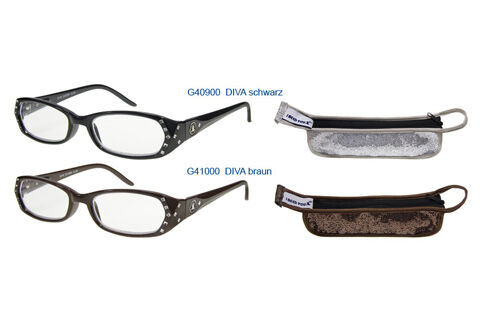 Die Diva Lesebrille ist ein elegnates Lesebrillenmodell mit Strasssteinen für Damen. Die Kunststoffgläser der Lesebrille haben eine Hartschicht zum Schutz der Gläser. In der Lieferung inbegriffen ist ein farblich passendes Etui mit Reissverschluss.