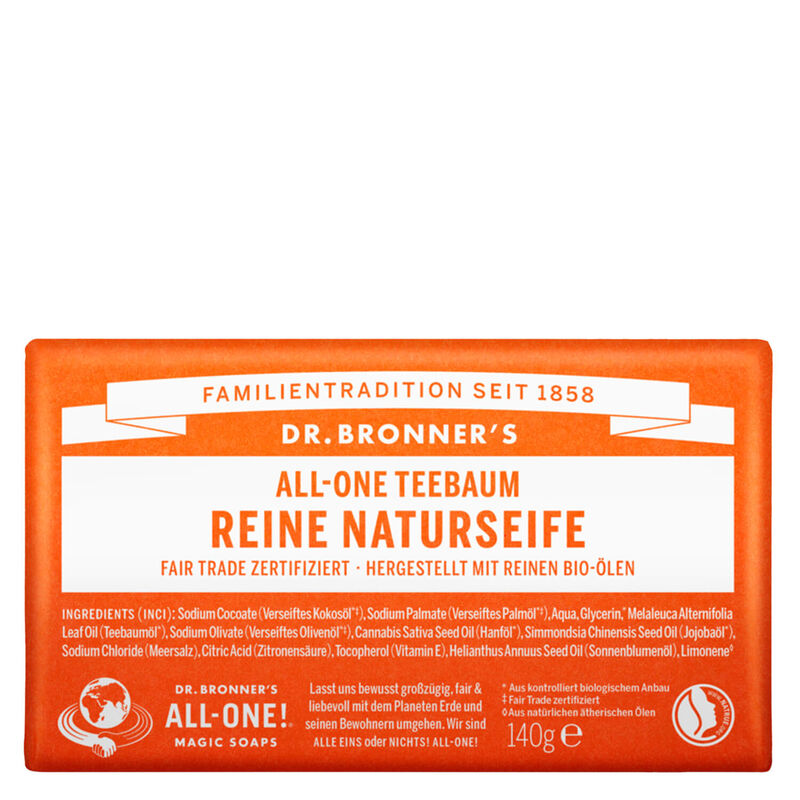 Ob bei Hauterkrankungen wie Akne Dermatitis und Psoriasis oder bei Schnittwunden: Bio-Teebaumöl schafft mit seiner antiseptischen Wirkung für Abhilfe oder zumindest Lieferung und ist ein wahres Wundermittel. Ihr Duft ist sehr individuell und besticht durch eine raffinierte und natürliche Würze. Hat man den Duft einmal ins Herz geschlossen will man ihn nie wieder hergeben. Dr. Bronner’s steht für faire Biokosmetik und baut auf einer konsequent nachhaltigen Wertschöpfungskette auf. Alle Inhaltsstoffe sind aus kontrolliert biologischem Anbau und fair trade zertifiziert. Die Produkte sind biologisch abbaubar und können in der Natur verwendet werden. Dr. Bronner’s Festseifen enthalten Bio Palmöl aus Dr. Bronner’s eigenen Serendipalm Projekt in Ghana ohne Monokulturen. Die Kleinbauern erhalten faire Preise und die Früchte werden vor Ort von Hand bearbeitet.
