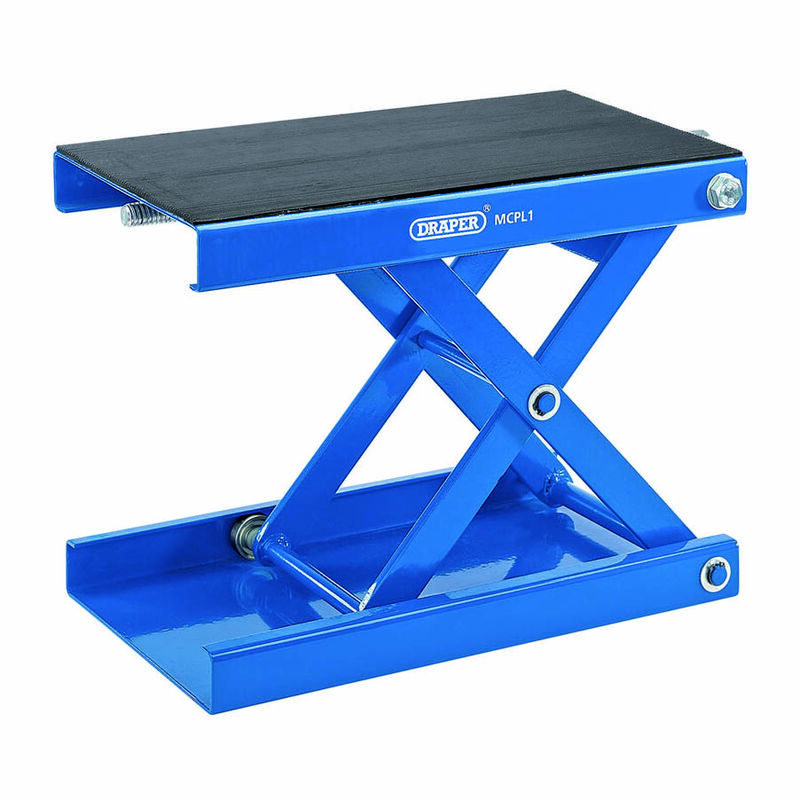 Scherenständer geeignet für den Einsatz auf dem Boden oder auf einer Motorradhebebühne. Gummimatte auf der Plattform verhindert Schäden an der Unterseite der Maschine. Ausgestattet mit kugelgelagerten Rollen für sanftes Heben und Senken. Produkteigenschaften: * Minimale Höhe: 8.4 cm * Maximale Höhe: 35.6 cm * Max. Tragkraft: 450 kg * Auflagefläche: 38 cm x 23 cm motostand,motorradständer,hubständer,bock,tretbock,lift stand,leve moto