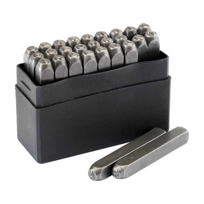 Set mit 26 Grossbuchstaben A-Z aus legiertem Werkzeugstahl, gehärtet und angelassen, schwarz lackiert. Verpackt in Kunststoffbox. Buchstabenhöhe: 4.7 mm schlagstempel,einschlagbuchstaben,prägestempel,stahl stempel,Letter Stamp Set