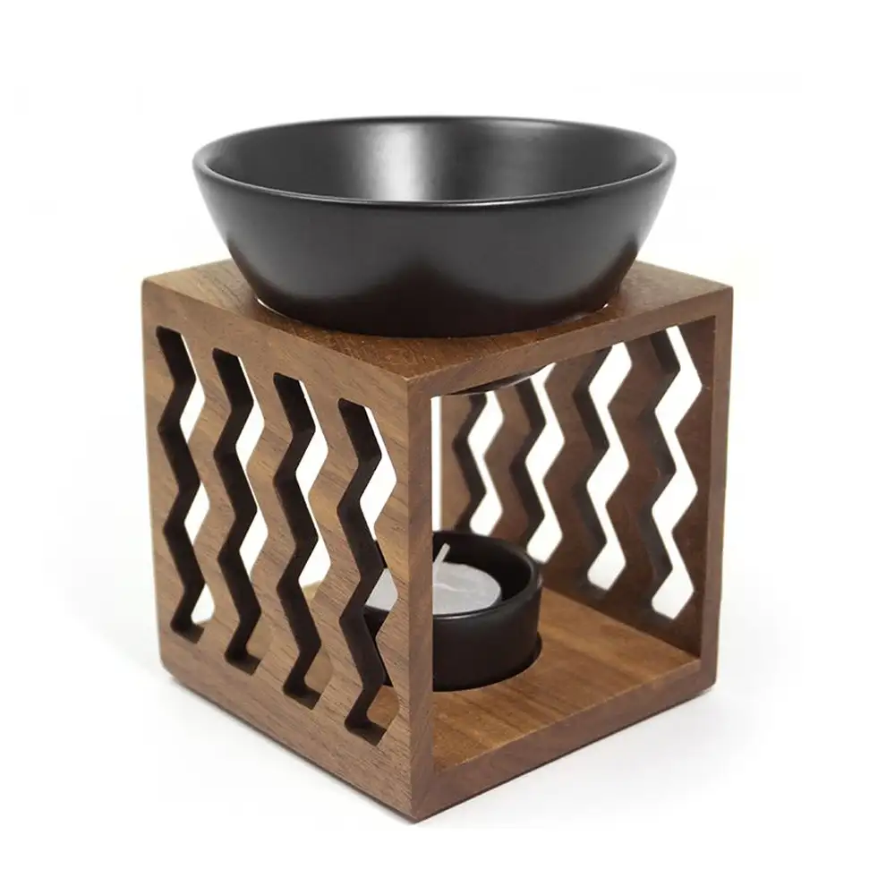 Quadratische Duftlampe aus dunkel gebeiztem Walnussholz mit anthrazitfarbiger Keramik-Wasserschale und -Teelichthalter.