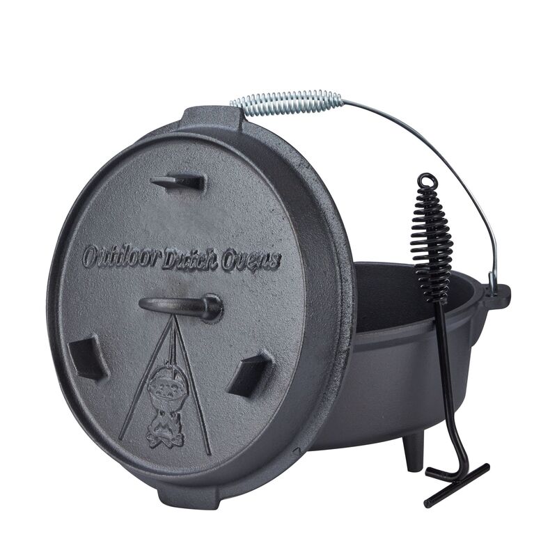 Ein Topf aus Gusseisen ist ideal für das Schmoren, Dämpfen und Frittieren von Gemüse und Fleisch im Freien. Ob im Garten oder auf einem Campingausflug: Nimm den Dutch Oven mit Standfüssen ganz einfach mit. Lege Kohle auf den Deckel für Oberhitze, mit dem Deckelheber machst du den Feuertopf danach wieder sicher auf. Das Gusseisen speichert die Hitze auch nach dem Kochen, so bleiben Gerichte lange warm, auch wenn sie Zuhause im Ofen zubereitet werden. Zaubere leckere Gerichte über offenem Feuer!