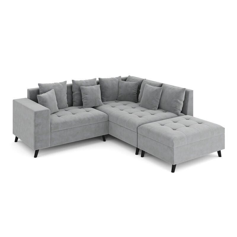 Suchst du ein Sofa für gemütliche Stunden vor dem Fernseher und genügend Platz für einen Feierabend-Apéro mit deinen Freunden? Dann ist dieses Ecksofa ELINA in Grau genau die richtige Wahl. Der weiche Samtbezug mit angenehmer Polsterung, die breite Armlehne und die dazu passenden Kissen garantieren höchsten Sitz- und Liegekomfort. Der Ottomane kann die Liegefläche vergrössern oder als zusätzlicher Sitzplatz dienen. Hol dir jetzt dieses Ecksofa und geniesse entspannte Stunden auf deinem neuen Lieblingsplatz!