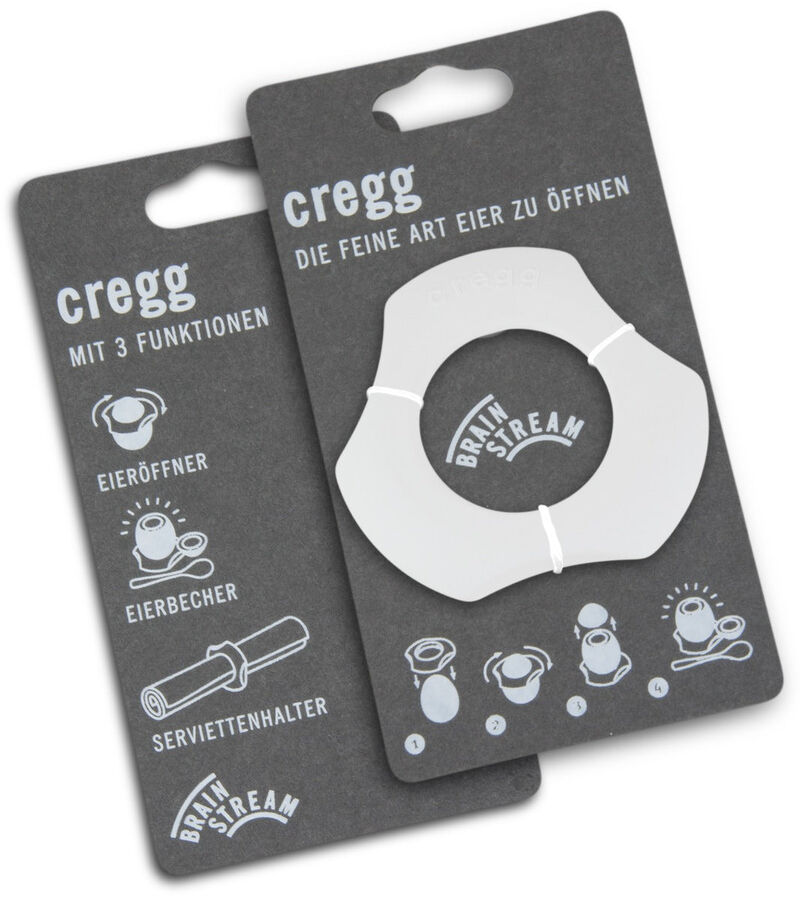 Keine Lust mit Messer und Löffel am Ei herum zu klopfen? Genervt vom Abpulen der zerhackten Schale? Dann ist cregg genau das Richtige. cregg ist die feine Art, an das Gelbe vom Ei zu kommen. Unser Eierschneider cregg öffnet das Frühstücksei mit Stil. Einfach cregg mit den Schneiderädern nach unten auf das Ei, leicht drücken und drehen. Jetzt ist die Eierschale zerschnitten und man kann die obere Hälfte des Eis abheben. Danach kann das stilvoll geöffnete Frühstücksei auf dem cregg deponiert werden – so kommt die zweite Funktion von cregg ins Spiel. Denn er ist auch Eierbecher. Ein echt multifunktionales Produkt.