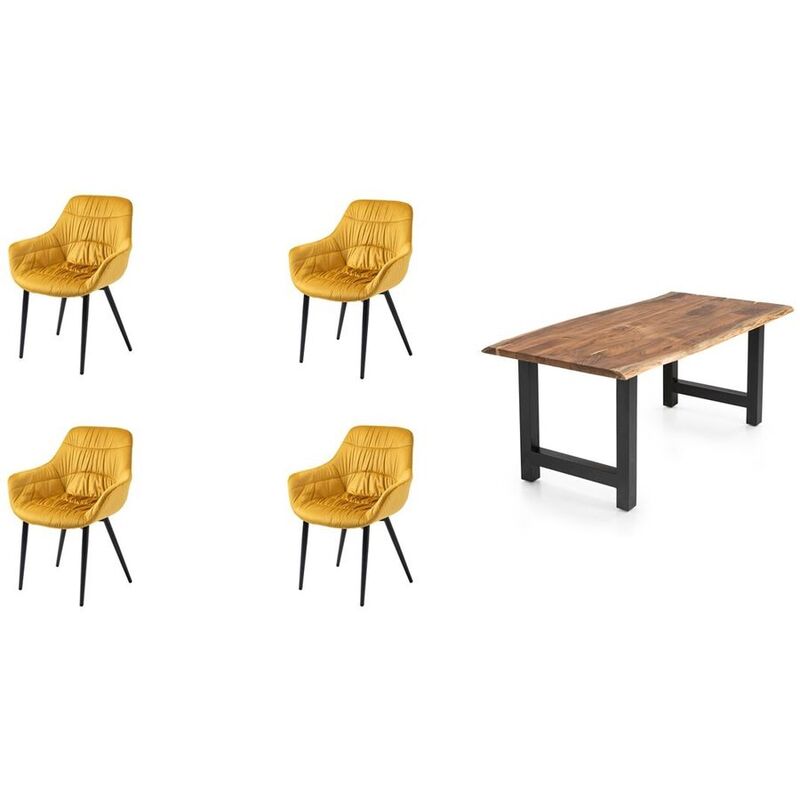 Essgruppe 5 tlg. 180×90 cm – Essgruppe Eats – Akazie/Samt – B 180 T 90 H 76.5 cm – Plattenstärke: 35 mm, Masse des Stuhls: 63x61x81.5
