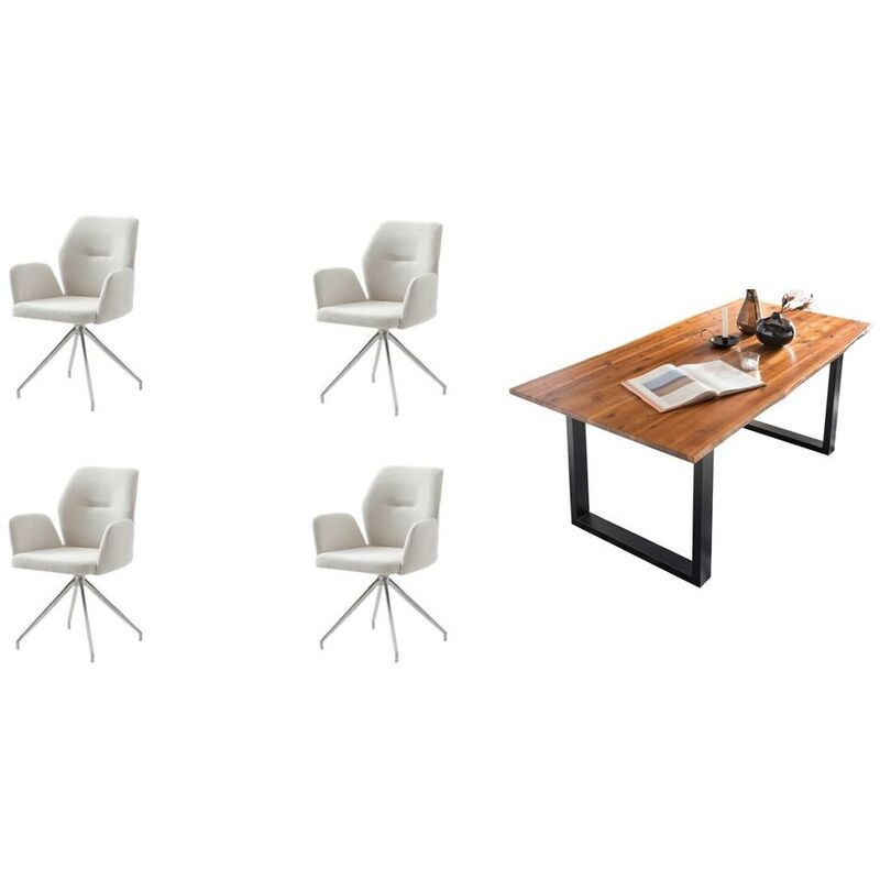 Essgruppe 5 tlg. 180×90 cm – Essgruppe Eats – Akazie/Strukturstoff – B 180 T 90 H 77 cm – Plattenstärke: 26 mm, Masse des Stuhls: 60x62x89