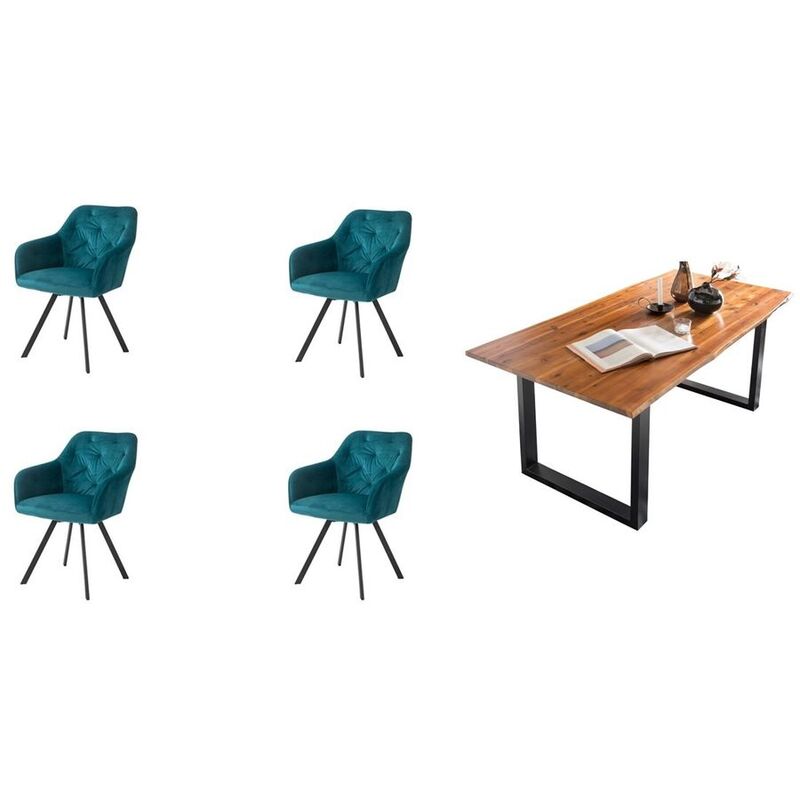 Essgruppe 5 tlg. 180×90 cm – Essgruppe Eats – Akazie/Samt – B 180 T 90 H 77 cm – Plattenstärke: 26 mm, Masse des Stuhls: 61x62x85