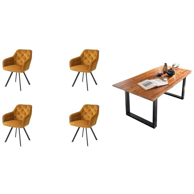 Essgruppe 5 tlg. 160×85 cm – Essgruppe Eats – Akazie/Samt – B 160 T 85 H 77 cm – Plattenstärke: 26 mm, Masse des Stuhls: 61x62x85