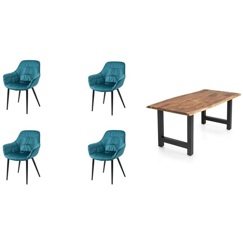 Essgruppe 5 tlg. 180×90 cm – Essgruppe Eats – Akazie/Samt – B 180 T 90 H 76.5 cm – Plattenstärke: 35 mm, Masse des Stuhls: 63x61x81.5