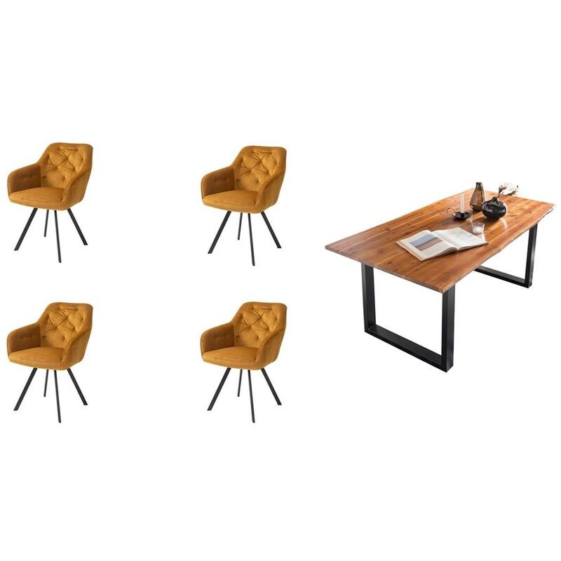 Essgruppe 5 tlg. 180×90 cm – Essgruppe Eats – Akazie/Samt – B 180 T 90 H 77 cm – Plattenstärke: 26 mm, Masse des Stuhls: 61x62x85