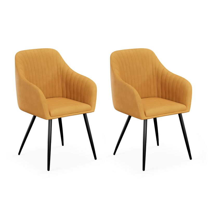 Dieser originelle Stuhl sorgt für einen fröhlichen Farbtupfer in deiner Küche oder deinem Esszimmer. Das helle Gelb des weichen Samtstoffes harmoniert wunderbar mit den stabilen Stuhlbeinen aus schwarzem Metall. Dank seinem schlichten Look und den stilvoll geformten Armlehnen passt er zu jedem Einrichtungsstil. Sitze ab jetzt bequemer mit diesem gelbfarbenen Esszimmerstuhl LEE im 2er-Set!
