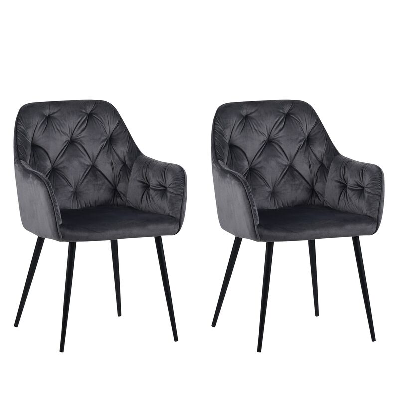 Dieses Sitzmöbel vereint Stil und Komfort: Das peppige Design überzeugt durch den grauen Samtstoff mit dekorativem Diamantmuster und setzt moderne Akzente in deiner Wohnung. Auf dem weichen Sitzpolster kannst du dich entspannt hinsetzen und zurücklehnen. Die schrägen Metallbeine vervollständigen den Look. Worauf wartest du noch? Gönn deinem Esszimmer ein Upgrade mit diesem Esszimmerstuhl PAMELA aus Samt im 2er Set!