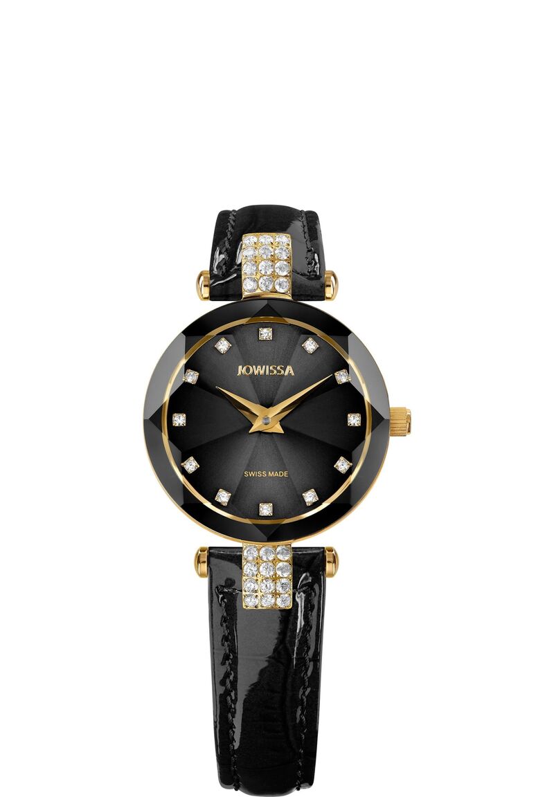 Eine Schweizer Uhr mit dem Herzen eines Juwels. An deinem Handgelenk wird ihr funkelnder Glasschliff dich verzaubern. Für edle Eleganz stehen das goldene Gehäuse im 25mm Durchmesser, das nachtschwarze Ziffernblatt mit Sonnenschliff und das hochwertige Kroko-Lederband: Die raffinierte Kombination von Uhr und Schmuck UhrwerkSchweizer Quarz-Uhrwerk der Marke Ronda mit Stunden- & Minutenanzeige und langer Batterielaufzeit ZifferblattMit reflektierendem Sonnenschliff Zeitanzeige12 applizierte Schmucksteine für die Stundenanzeige ZeigerDauphine-Stil, diamantiert GehäuseRostfreies Edelstahlgehäuse mit Strasssteinbesetzung in Pavé Fassung GehäuseoberflächeGlanzpoliert und ionenbeschichtet in gold GehäusebodenEdelstahl Pressboden ohne Schrauben für den einfachen Batteriewechsel Gehäusedurchmesser25 mm Gehäusehöhe8 mm Wasserdichtigkeit5 ATM (regenfest) UhrglasGehärtetes Mineralglas mit vollflächigem Diamantschliff LunetteIm Glas integriert als Metallisierung BandmaterialEchtes Leder-Uhrband mit glanzlackierter Alligatorprägung Bandanstossbreite12 mm SchliesseAus Edelstahl mit lasergraviertem Logo VerstellbereichHandgelenkumfang von 135-185 mm Auswechselbares BandJa GeschlechtWeiblich Swiss Madein der Schweiz von Hand assembliert ColorGold / Schwarz ReferenceJ5.614.S