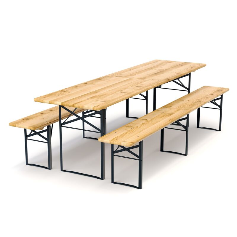 Verbringen Sie das nächste Familienfest oder die nächste Gartenparty an diesem Festbank. Die Festgarnitur überzeugt durch ihre schlichte Funktionalität und das platzsparende Design. Das Metallgestell ist robust gebaut und kann mittels Scharniere sicher arretiert werden. Dank der durchsichtigen Lackschicht auf der Tischplatte können Getränke und Schmutzflecken problemlos weggewischt werden. Der Holztisch und die Bänke können nach Gebrauch einfach zusammengeklappt und aufeinandergestapelt werden. Holen Sie sich jetzt diese multifunktionale Bierzeltgarnitur auf Ihre Gartenterrasse!