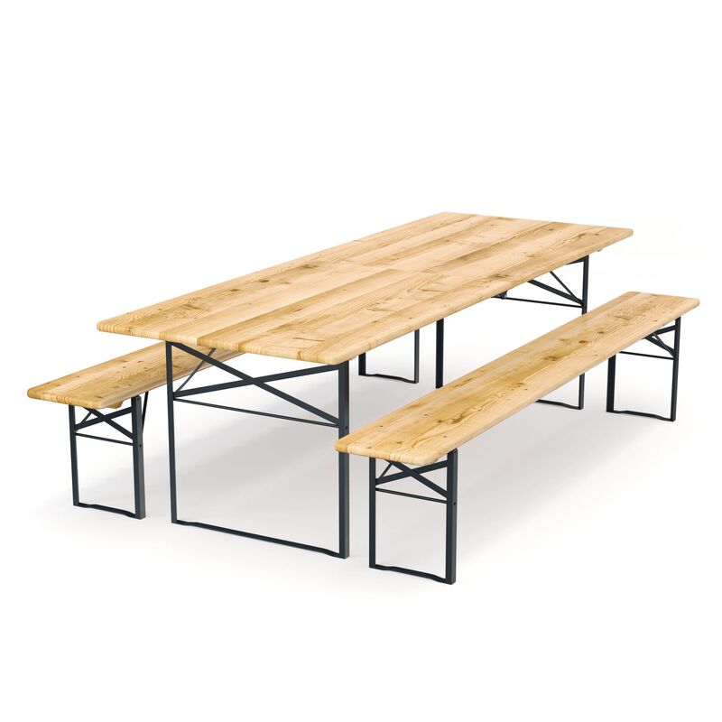 Hoch die Tassen! An diesem Holztisch feierst du ausgelassene Feten im eigenen Garten. Egal ob Oktoberfest, Party oder Kindergeburtstag – diese Festgarnitur erfüllt überall ihren Zweck. Die Tischbeine und die Beine der Sitzbänke lassen sich ganz einfach einklappen und die Garnitur kann so platzsparend gestapelt werden. Das schöne Naturholz ist mit einem Klarlack beschichtet, der Flüssigkeiten abweist und vor Holzsplittern schützt. Die Metallbeine sorgen zudem für einen guten Stand. Lass dich von den Vorzügen dieser Bierzeltgarnitur überzeugen und hole sie dir für die nächste Gartenparty!