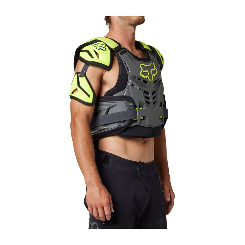 Die Weste Raptor garantiert umfassenden Schutz und uneingeschränkte Abdeckung. Der Oberkörper ist vollständig abgedeckt und umfassend geschützt durch die Seitenpanels aus Kunststoff, den verstärkten Schutz am unteren Rücken, das doppellagige BioFoam-System und die umfassende Lüftung. Die Raptor ist in Sachen Abdeckung und Performance einfach unübertroffen. Die Brust- und Rückenprotektoren wurden für die CE-Zertifizierung der Leistungsstufe 2 geprüft und bieten zuverlässigen Schutz auf dem Track oder Trail. * Umfassender Schutz des Oberkörpers durch Seitenprotektoren aus Kunststoff * Verstell- und herausnehmbare Schulter- und Bizeps-Protektoren * Nackenstützen-Kompatibilität durch verstellbares Frontpanel * Integriertes Schnallensystem * Nach CE EN 1621-2 LEISTUNGSSTUFE 2 zertifizierter Rückenprotektor * Nach CE EN 1621-3 LEISTUNGSSTUFE 2 zertifizierter Brustprotektor BY_OPEBFOXSEMX23,fox motocross,fox mx,fox 2023,fox2023,fox mx23,fox mx 2023,fox motocross 23,fox motocross 2023,fox mx bekleidung 2023,fox motocross bekleidung 2023,fox motocross ausrüstung 2023,panzer,brustschutz,brustpanzer,roost protector,protection,protezzione,deflector,brustschoner,schlagschutz,deflector,roostguard