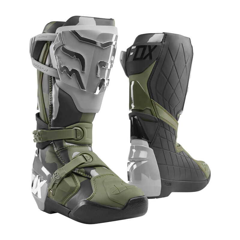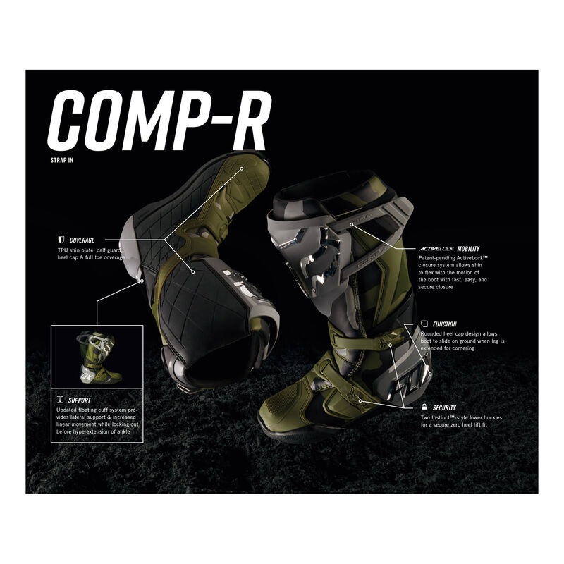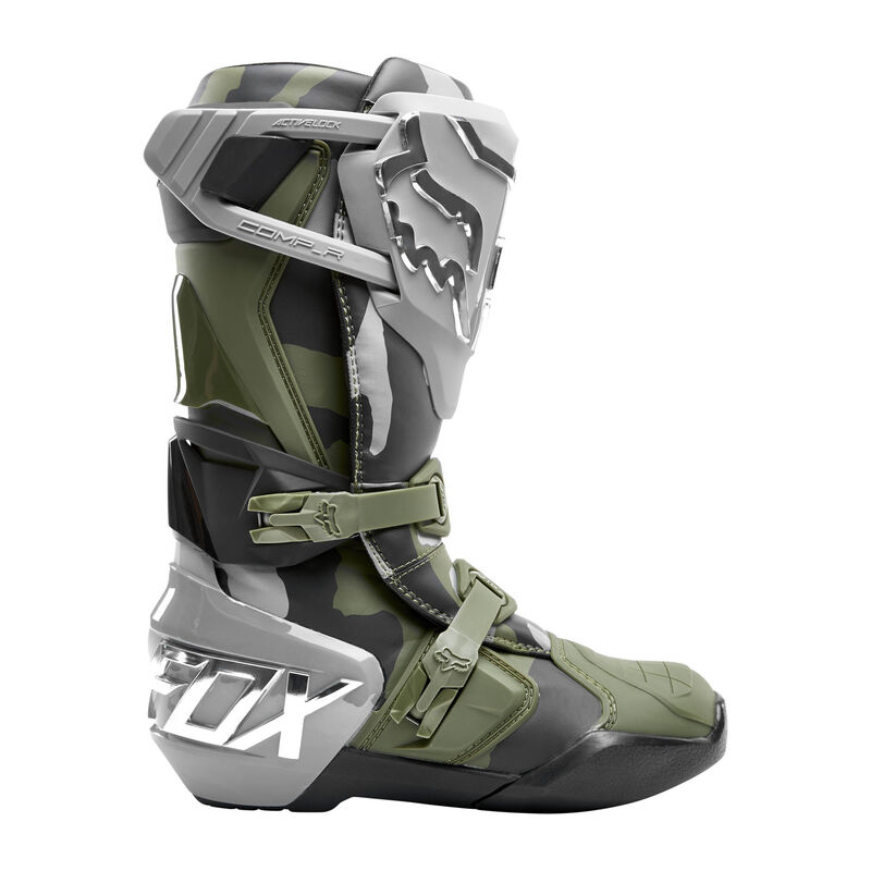 Mit den neuen Comp R Boots gehören Ablenkungen und Einschränkungen endgültig der Vergangenheit an. Mit ihrem minimalistischen, praktischen Design kombinieren die Comp R unseren exklusiven ActiveLock-Verschluss mit einem Spezial-Gelenksystem für in ihrer Kategorie unschlagbare Bewegungsfreiheit. Die beiden unteren Instinct-Gelenkschnallen bieten deinem Fuss sicheren Halt und ziehen das Fussgelenk in den Stiefel. Für Halt und Flexibilität ist der Wadenverschluss mit dem ActiveLock-Silikonstreifen ausgestattet. Dank des Spezial-Gelenksystems an der Ferse passt sich der Stiefel auf natürliche Weise deinen Bewegungen an und sorgt somit für verbesserte Wendigkeit auf der Maschine, schützt jedoch zuverlässig vor der Überstreckung des Fussgelenks. Alles in allem bieten diese Crossboots passgenauen Sitz ohne Zugbeanspruchung der Ferse und optimalen Tragekomfort bereits beim ersten Tragen. Kunststoffprotektoren an Schienbein, Wade, Ferse und Zehenkappe lassen wenig Angriffsfläche. Und dank des Spezial-Gelenksystems muss dieses robuste Modell in Sachen Flexibilität absolut keine Punkte einbüssen. Der Schaft- und Verbrennungsschutz aus solidem Kautschuk bietet maximalen Grip und dauerhafte Beständigkeit. Die Aussensohle garantiert selbst auf abgestumpften oder scharfkantigen Fussrasten herausragenden Grip. * Das überarbeitete Spezial-Gelenksystem bietet seitliche Abstützung + gesteigerte lineare Bewegungsfreiheit, schützt jedoch zuverlässig vor der Überstreckung des Fussgelenks. * TPU-Schienbeinschutz, Wadenschutz, Fersenkappe + umfassender Zehenschutz * Zum Patent angemeldetes ActiveLock-System am Schienbein für zusätzliche Flexibilität mit schnellem, einfachem und sicherem Verschluss * Robuste Schaftkappe und Verbrennungsschutz aus Gummi für ausgezeichneten Grip und Kontakt zur Maschine * Beständige Aussensohle aus Gummi mit integriertem Stahlschaft * Zwei untere Instinct-Schnallen für sicheren Halt ohne Fersenerhöhung * Innenfutter aus innovativem Material für erstklassigen Komfort ab dem ersten Moment BY_A2FK0OT2XI2ON,BY_BFDOOIOXSTCSNT,BY_RTEUWLW,camowear,tarnanzug,army,military,camouflage,töffstiefel,mx boot,bottes,stivali,motorradstiefel,motocrossstiefel,ofrroadstiefel,cross stiefel,mx stiefel,crossschuhe,foxmx,fox20,fox2020,20er fox,foxracing,foxracing20, 2020
