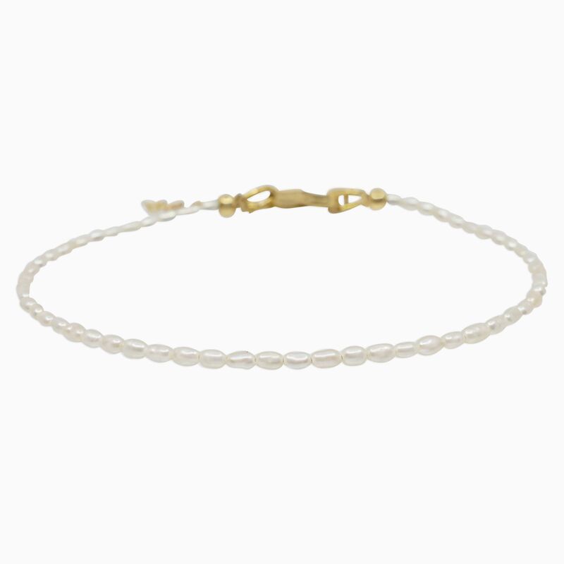 Sanft und einzigartig. Die feinen Perlen des Fusskettchens Fiore sind eine schlichte und elegante Begleitung für jeden Tag. Jede dieser Perlen ist ein Einzelstück und wird von Hand in unserem Atelier aufgezogen.