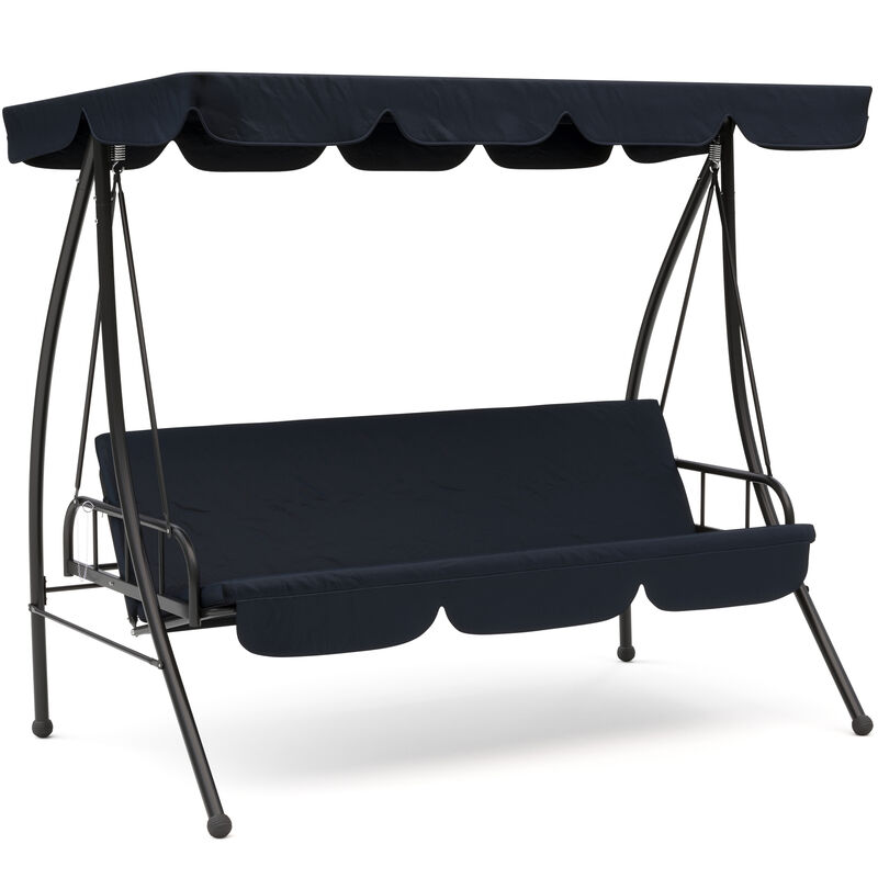 Diese schwarze Hollywoodschaukel ist nicht nur ein Hingucker sondern lädt auch zum gemütlichen Verweilen ein. Durch die runterklappbare Rückenlehne lässt sich die komfortable Sitzbank im Nu in eine bequeme Liegefläche verwandeln. Das grosse Sonnendach lässt sich je nach Sonnenstand anpassen und spendet angenehmen Schatten. Dank der Stahlrohrkonstruktion und der wasserabweisenden Stoffbespannung ist das Gartenmöbel robust und langlebig. Holen Sie sich mit dieser Hollywoodschaukel Ferienstimmung in den eigenen Garten!