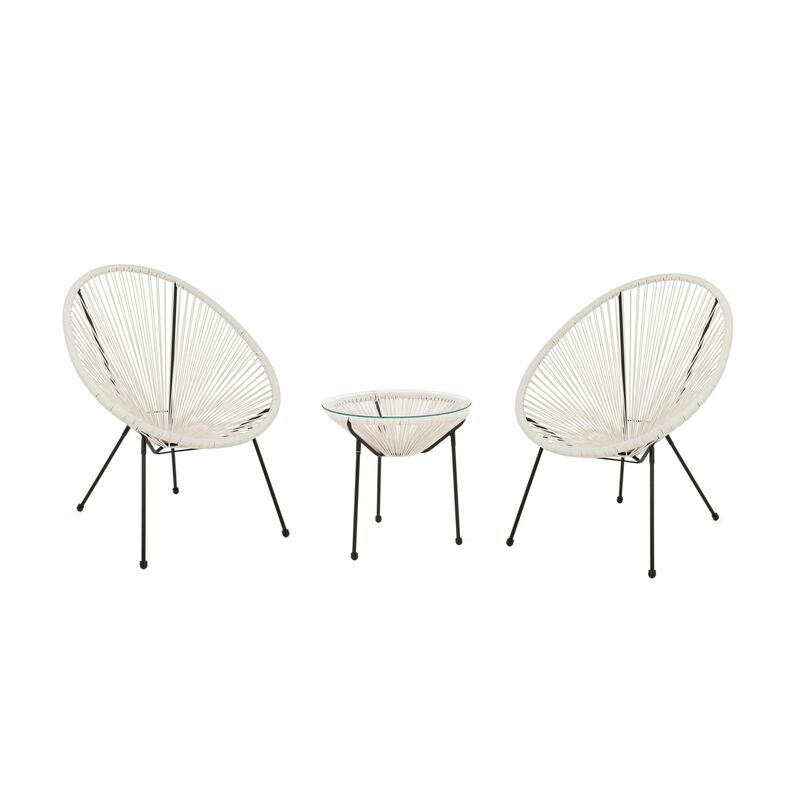 Die kleine Sitzgruppe in edlem Weiss mit pflegeleichter Kunststoffbespannung aus Rattan, eignet sich ausgezeichnet fürs gemütliche Beisammensein im Garten oder auf dem Balkon. Die ovale Form der Stühle ermöglicht das bequeme Sitzen und Zurücklehnen. Der dunkle Stahlrahmen ist witterungsfest und die Glasplatte des Beistelltisches ist herauslösbar. Holen Sie sich jetzt das elegante Acapulco Gartenmöbel Set in Weiss zu sich auf die Terrasse!
